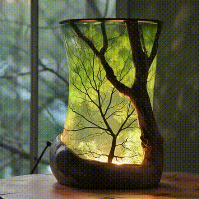 🌿 Immerse yourself in the calming glow of this nature-inspired lamp, where light filters through delicate leaf patterns and the silhouette of a tree, creating a tranquil forest scene inside your home.